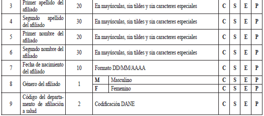 Tabla 9 Estructura del Archivo Maestro de Afiliados a Medicina Prepagada, Seguros de Salud o Planes Adicionales de salud.