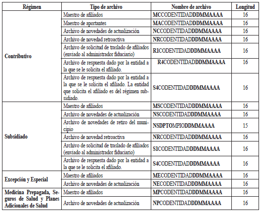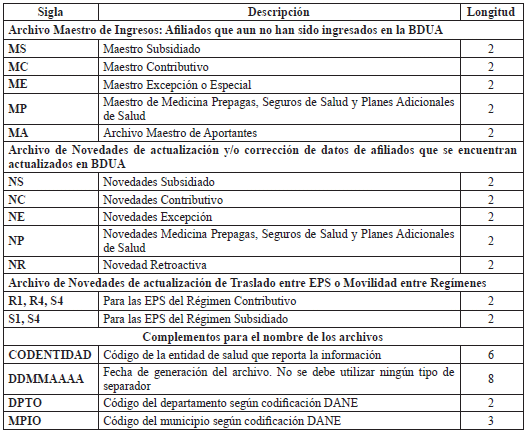 1. Tipo de archivos a entregar por parte de las entidades en los procesos de actualización de la BDUA.