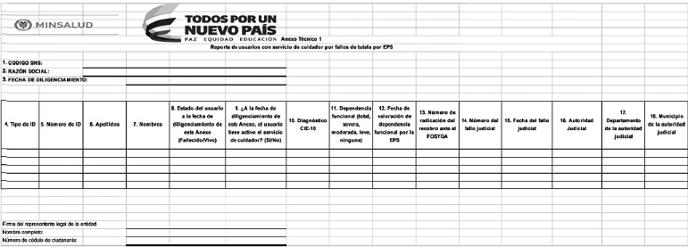 1. Reportar al Ministerio de Salud y Protección Social – Dirección de Administración de Fondos de la Protección Social o la Entidad que haga sus veces, dentro de los treinta (30) días hábiles siguientes a la expedición de esta Resolución, en el formato establecido para el efecto en el Anexo 1 de la misma, los afiliados a quienes se les haya prestado servicio de cuidador en cumplimiento de fallos de tutela que ordenan atención integral.
