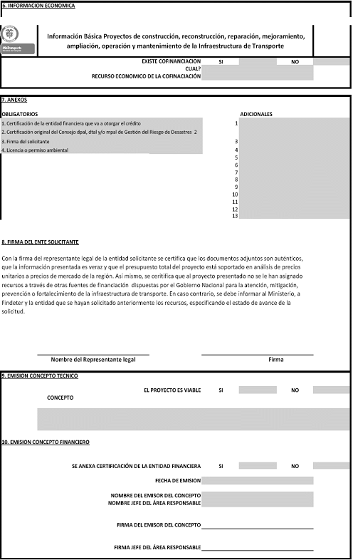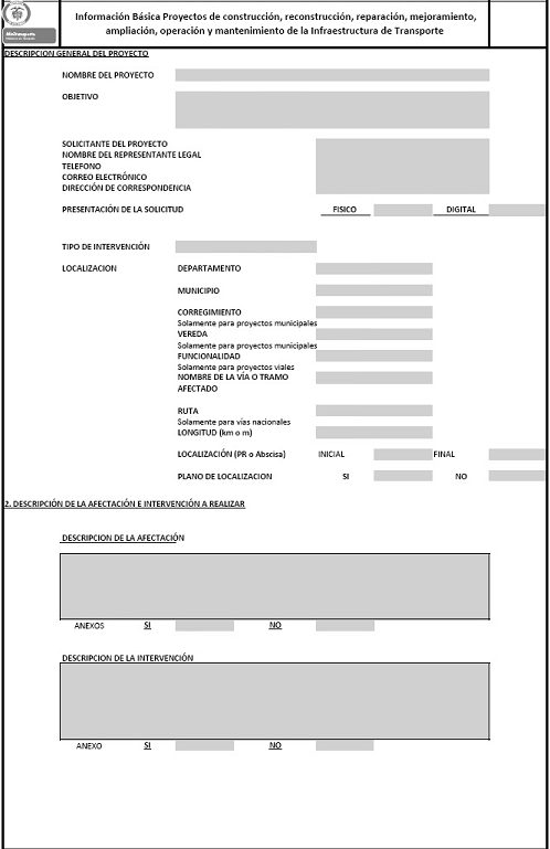 1. Formato de solicitud denominado Información Básica Proyectos de construcción, reconstrucción, reparación, mejoramiento, ampliación, operación y mantenimiento de la Infraestructura de Transporte –Anexo 1–.
