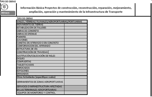 En el formato de solicitud –Anexo 2– deberá especificar el tipo de la obra que van a realizar con el equipamiento que pretenden adquirir e informar si la solicitud se ha presentado ante otra fuente de financiación dispuesta por el Gobierno Nacional Central para la atención, mitigación, prevención o fortalecimiento de la infraestructura de transporte, en caso afirmativo, debe informar al Ministerio, a Findeter y a la entidad a la cual se le ha solicitado anteriormente los recursos, especificando el estado de avance de la solicitud.