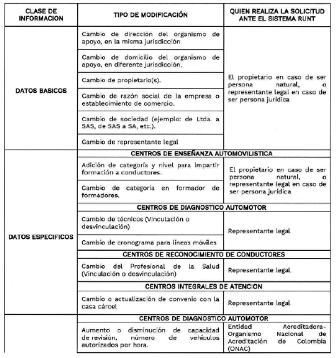 4. Registro de datos complementarios del Organismo de Apoyo. El propietario, o representante legal, deberá incluir en el sistema del Registro Único Nacional de Tránsito (RUNT) los datos adicionales que se requieran los cuales dependerán del tipo de modificación requerida la cual estará sujeta a la clase de información y solo para los casos que se indican a continuación: