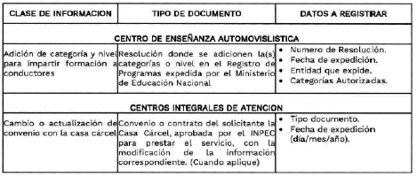 En este espacio se encontrarán datos como: Registro de Datos de personal autorizado en el caso de los Centros de Diagnóstico Automotor (COA), los literales e) y f) del artículo 3o de la presente resolución, los Centros de Enseñanza Automovilística (CEA), Registro de datos del personal profesional de la salud en el caso de Centros de Reconocimiento de Conductores y registro de los instructores de los Centros Integrales de Atención, Centros de Enseñanza Automovilística y Organismos de Tránsito para realizar cursos sobre normas de tránsito.