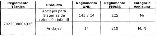 Que el Ministerio de Transporte mediante Resolución número 20253040005415 de 2025, por la cual se prorroga la entrada en vigencia de la Resolución número 20223040044845 de 2022 en lo relacionado con las cintas retrorreflectivas para uso en vehículos automotores y remolques; la Resolución número 20223040044935 de 2022 en lo relacionado a los sistemas de retención para uso en vehículos automotores; y la Resolución número 20223040044945 de 2022 en lo relacionado a los acristalamientos de seguridad para uso en vehículos automotores y remolques; se prorrogó hasta el 22 de septiembre de 2025 la entrada en vigencia de la Resolución número 2022304004935 de 2022, para el producto de Anclajes para Sistemas de retención infantil, para la categoría vehicular M1; Reglamento ONU 145 y 14; y del Reglamento FMVSS 225.