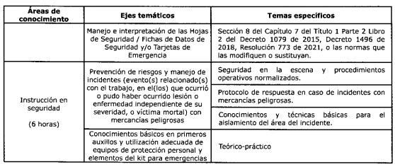 “Artículo 5o. Contenido e intensidad horaria del curso básico obligatorio de capacitación para conductores que transportan mercancías peligrosas. El curso básico obligatorio de capacitación para conductores que transportan mercancías peligrosas, podrá ser desarrollado de manera presencial o bajo la metodología a distancia y con estrategia de educación virtual, en la proporción porcentual determinada en la Resolución número 15177 de 2022 del Ministerio de Educación, o aquella que la modifique, adicione o sustituya y contemplará, como mínimo, las áreas de conocimiento, ejes temáticos, temas específicos e intensidad horaria, que se determina en la siguiente tabla: