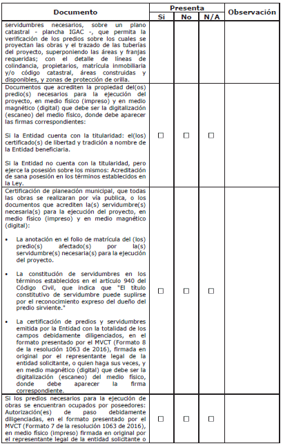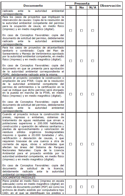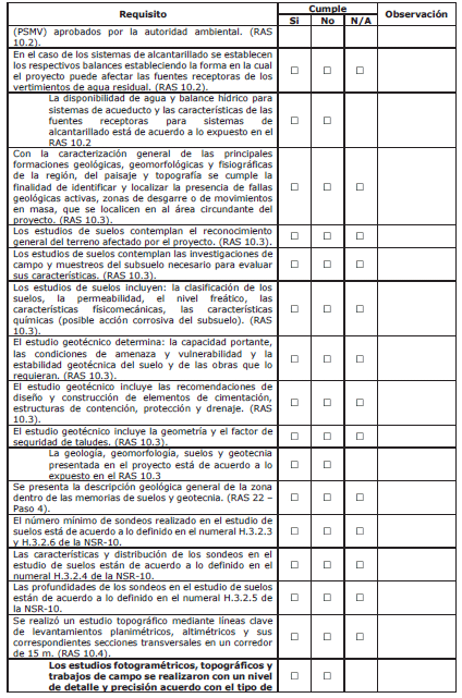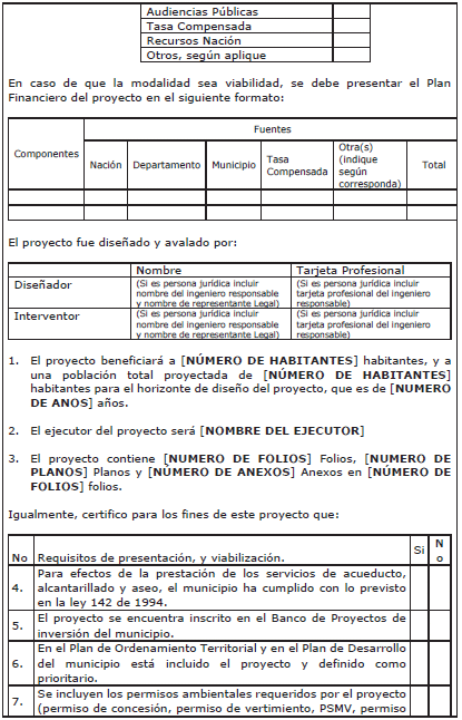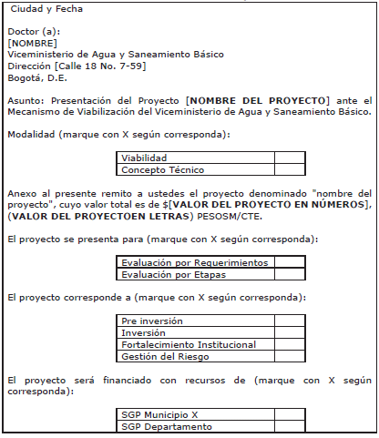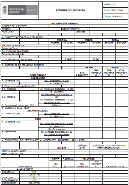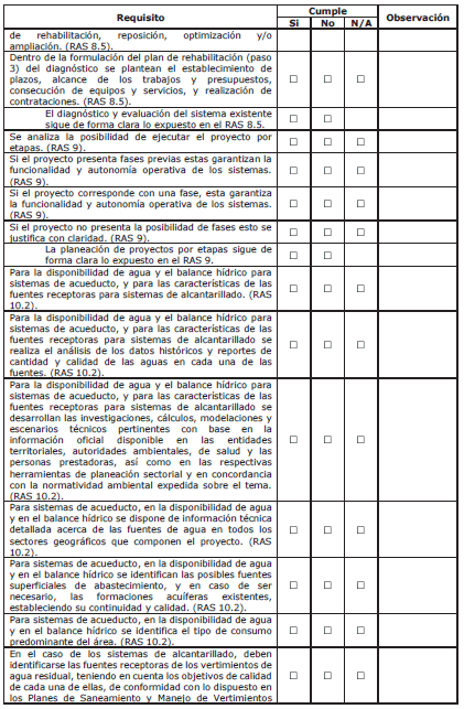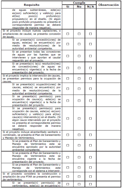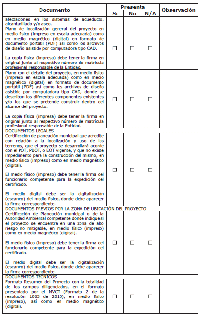 En este documento se presenta a manera de guía obligatoria para la revisión documental, permisos e impacto para la presentación de proyectos de agua potable y saneamiento básico, prevista en la presente Resolución dentro del procedimiento para presentación y evaluación de proyectos. Deberá ser empleado por quienes formulan, presentan y/o revisan los proyectos que quieren ser presentados al mecanismo de viabilización del ministerio siguiendo las disposiciones de la presente resolución.