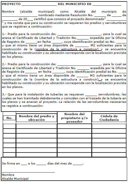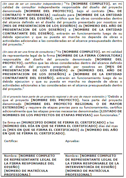 22. Certificación de funcionalidad: Yo [NOMBRE COMPLETO], en mi calidad de representante legal del municipio de [NOMBRE DEL MUNICIPIO], certifico que las etapas anteriores del proyecto denominado [NOMBRE DEL PROYECTO], se encuentran funcionando adecuadamente6.