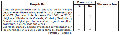 De no cumplir alguno de estos requerimientos la documentación no será recibida por el Ministerio de Vivienda Ciudad y Territorio.