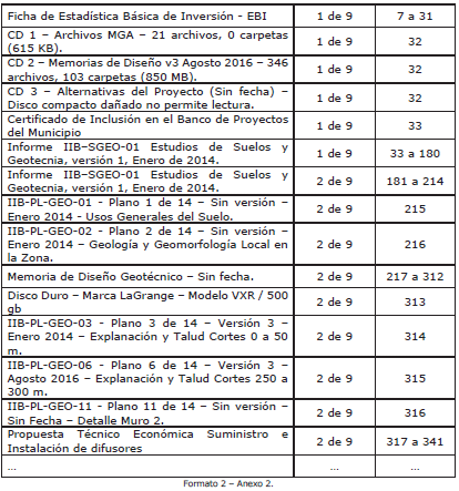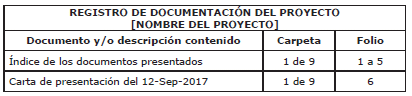 Se deberá registrar en detalle en que consiste la documentación presentada por el proyecto describiendo brevemente su contenido. A manera de ejemplo se presenta la siguiente tabla donde se expone la forma en que se detallará la información.