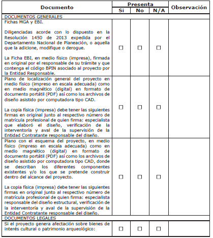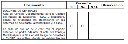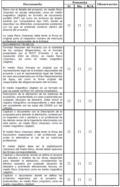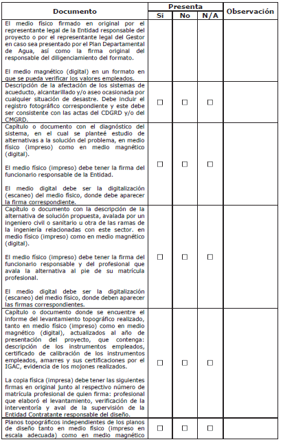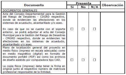 En la siguiente tabla aparece los mínimos documentos que deben ser presentados por las Entidades Territoriales o Gestores de los Planes Departamentales de Agua para que un proyecto de inversión en rehabilitación, reconstrucción, prevención y/o mitigación de riesgos de los sistemas de acueducto, alcantarillado y/o aseo, mayores a 450 SMMLV ingrese al instrumento de evaluación.
