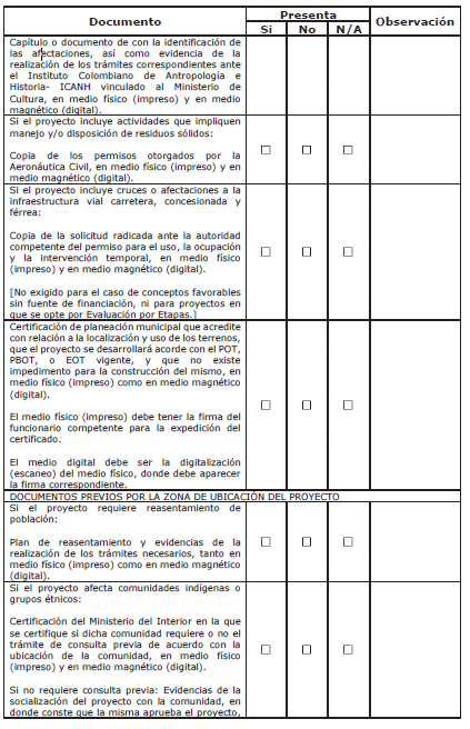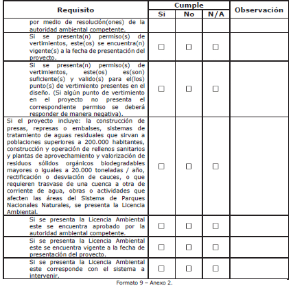En la revisión documental se verificó la existencia de los permisos ambientales presentados para proyectos de inversión. Sin embargo, se deberá realizar una revisión de la vigencia, la validez y la coherencia de los permisos ambientales presentados por el proyecto, teniendo en cuenta las salvedades expuestas en los Parágrafos 1 y 2 del numeral 6 del artículo 9 de la resolución.