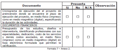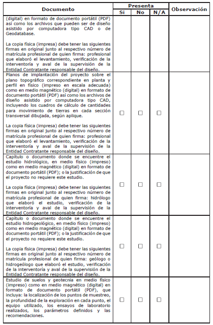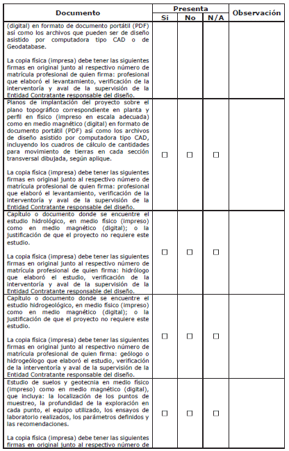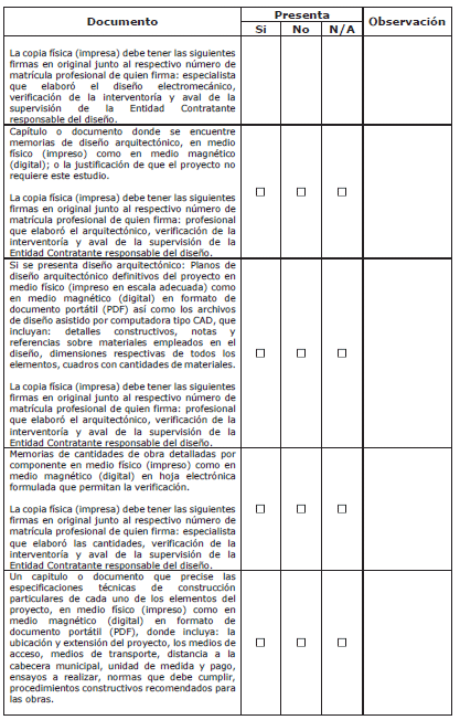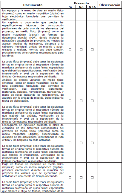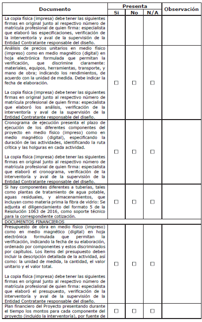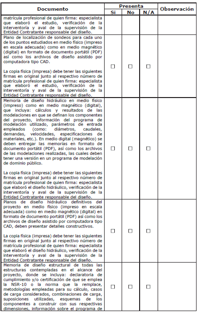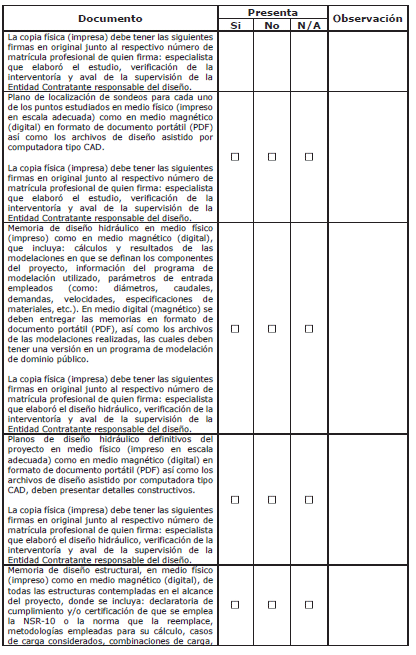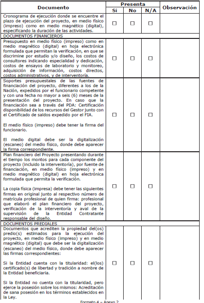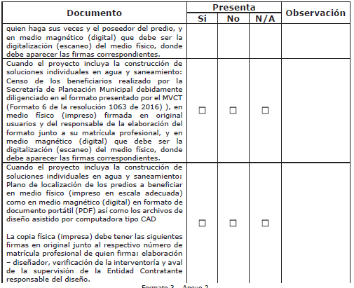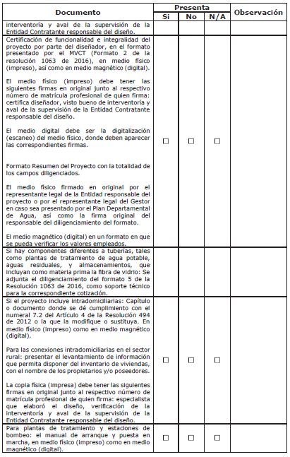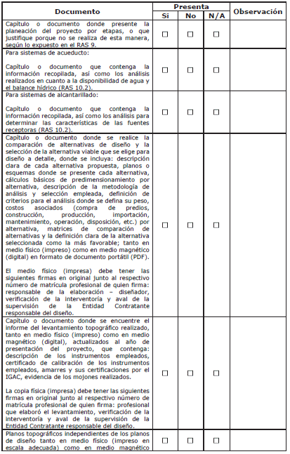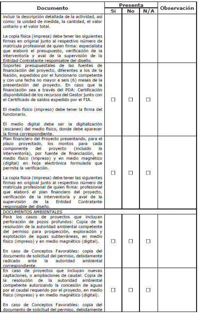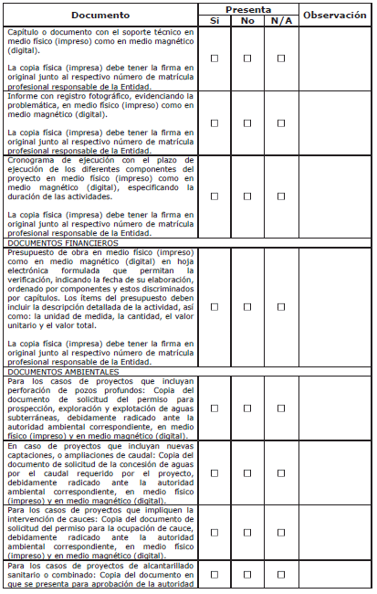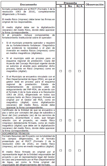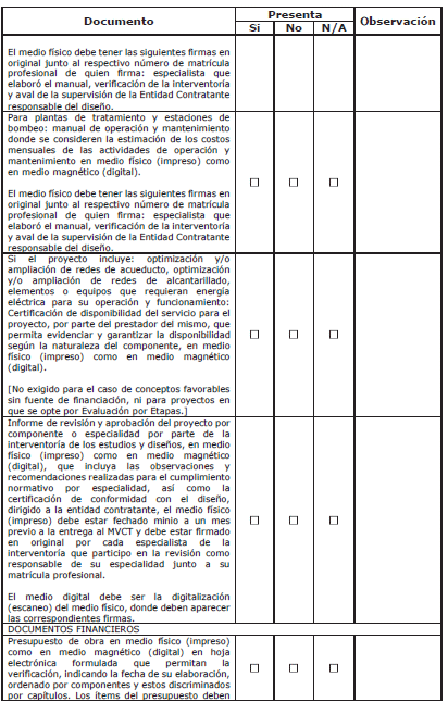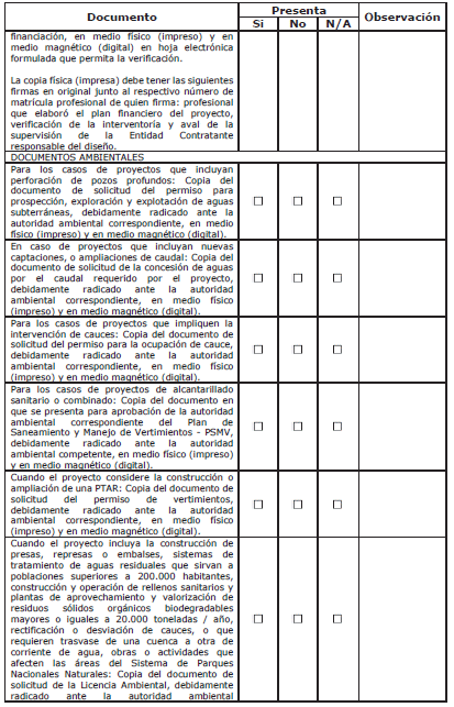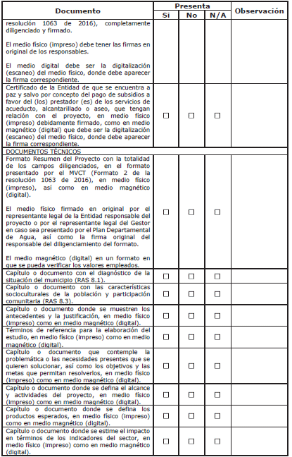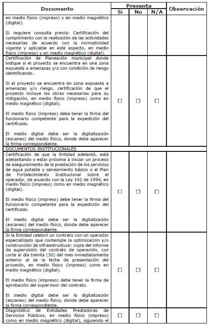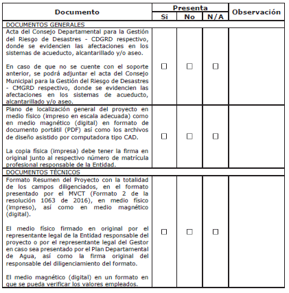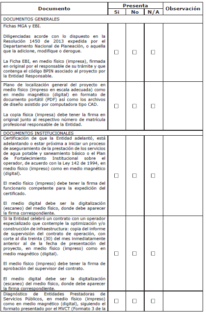 De no presentar alguno de estos documentos el proyecto podrá ser devuelto a la Entidades Territoriales o Gestores de los Planes Departamentales de Agua correspondiente, indicando el(los) documento(s) faltantes.