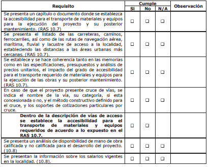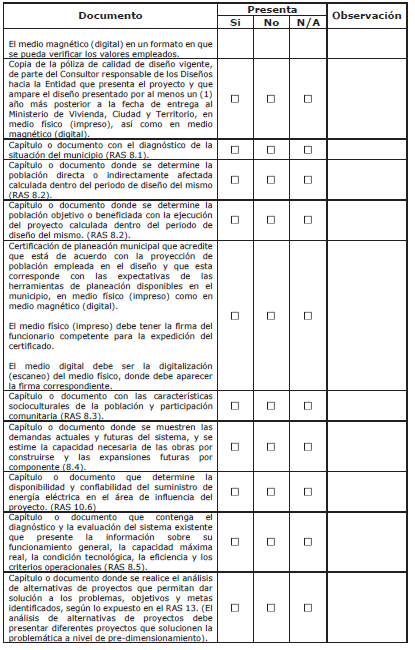 Los proyectos que sean presentados por las Entidades Territoriales o Gestores de los Planes Departamentales de Agua deberán cumplir como mínimo los requisitos que se presentan a continuación para ser recibidos por el mecanismo de viabilización de proyectos del Ministerio de Vivienda, Ciudad y Territorio a través del Viceministerio de Agua y Saneamiento Básico. A excepción de los Proyectos que vayan a ser evaluados por etapas donde se registraran las falencias o incumplimientos para ser informadas en la Etapa 1 - Evaluación de concepción y funcionalidad.