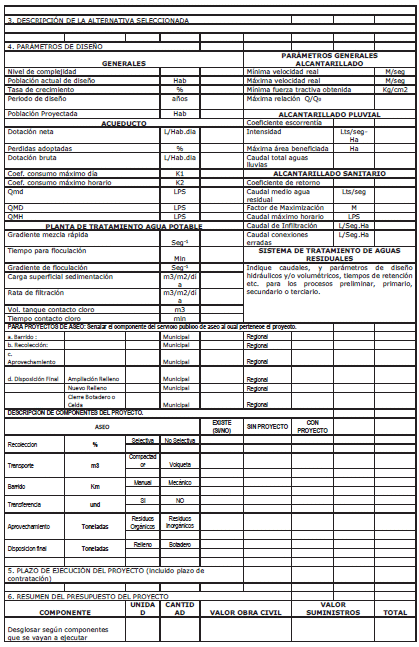 Estos requisitos siguen lo expuesto en el Articulo 13 – Requisitos para la presentación de proyectos, de la presente Resolución y el Capítulo II – Presentación de proyectos del sector de agua potable y saneamiento básico, de la guía anexa a la misma resolución.