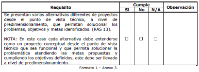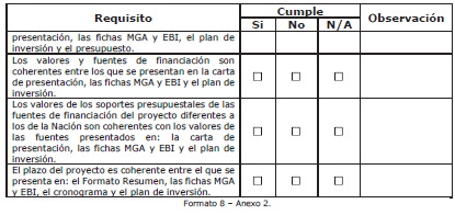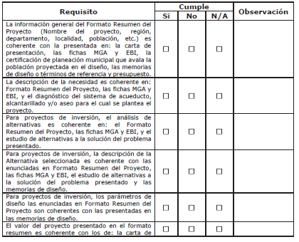En la siguiente tabla aparecen los requisitos de verificación para la coherencia entre los documentos del proyecto para que este ingrese al instrumento de evaluación.