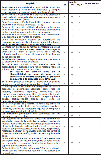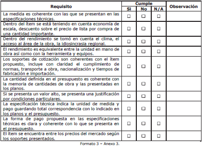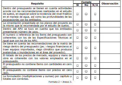 Esta verificación corresponde con la revisión general del presupuesto, el análisis de precios unitarios, las especificaciones técnicas, la memoria de cantidades de obra y el listado de precios presentado por la Entidad responsable, verificando su coherencia con el proyecto y si el alcance costeado cumple con los objetivos planteados.