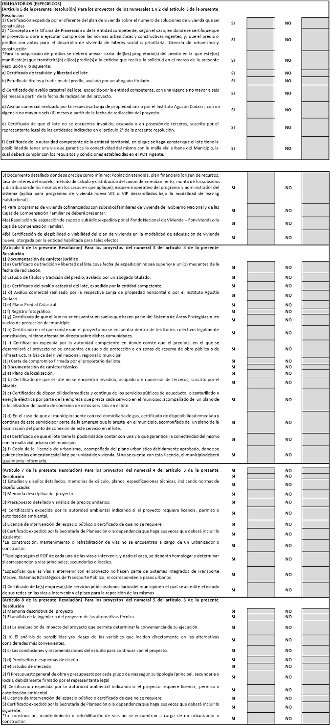 ARTÍCULO 4o. REQUISITOS GENERALES. <Resolución derogada por el artículo 19 de la Resolución 300 de 2015> Para efectos de la viabilidad técnica y financiera que debe expedir el Ministerio de Vivienda, Ciudad y Territorio, conforme a lo dispuesto por el artículo 6o del Decreto 2048 de 2014, los oferentes de cualquier tipo de proyecto deberán presentar ante este Ministerio, los siguientes documentos.