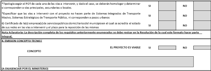 7. Certificación de que la zona en donde se desarrollará el proyecto no se encuentra en estado de afectación o riesgo no mitigable. Tal certificación, deberá ser expedida por el Consejo Municipal o Distrital para la Gestión del Riesgo. En el evento en el que el municipio o distrito, no cuenten con los estudios o soportes técnicos respectivos, dicha certificación deberá ser expedida por el Consejo Departamental para la Gestión del Riesgo o por la Unidad Nacional para la Gestión del Riesgo de Desastres.