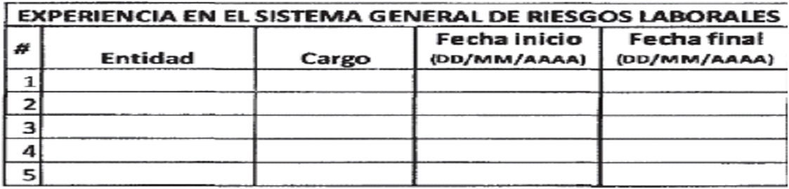 Anexos No 2 y 3. Experiencia en el Sistema de Riesgos Laborales. (Campos Obligatorios)