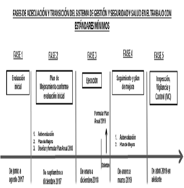 ARTÍCULO 10. FASES DE ADECUACIÓN, TRANSICIÓN Y APLICACIÓN DEL SISTEMA DE GESTIÓN DE SEGURIDAD Y SALUD EN EL TRABAJO CON ESTÁNDARES MÍNIMOS, DE JUNIO DEL AÑO 2017 A DICIEMBRE DEL AÑO 2019. <Resolución derogada por el artículo 37 de la Resolución 312 de 2019> Las fases de adecuación, transición y aplicación para la implementación del Sistema de Gestión de Seguridad y Salud en el Trabajo con Estándares Mínimos, durante este período, es: