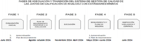 Entre julio de 2023 y julio de 2024 se implementarán los Estándares Mínimos del Sistema de Garantía de la Calidad de las Juntas de Calificación de Invalidez, de acuerdo con las fechas que se especifican en la gráfica.
