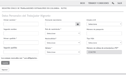 3.4. El uso de la información registrada previamente en el módulo (RUE), es necesaria para habilitar el sistema, ingrese el número de extranjería o el número PEP del Trabajador Migrante.