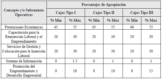 ARTÍCULO 6o. SUBCUENTAS DEL FOSFEC PARA GASTOS OPERATIVOS. <Artículo modificado por el artículo 1 de la Resolución 3584 de 2019. El nuevo texto es el siguiente:> Para la atención de los servicios a cargo del Fondo de Solidaridad de Fomento al Empleo y Protección al Cesante (FOSFEC), y como gastos operativos en los términos del inciso 1 del parágrafo 3 del artículo 2.2.6.1.3.14 del Decreto número 1072 de 2015, las Cajas de Compensación Familiar apropiarán los recursos que resulten de la diferencia entre el monto total recaudado de las distintas fuentes de financiación del FOSFEC, y la apropiación para los gastos de administración para la vigencia 2019, determinando sus apropiaciones entre los siguientes rangos de porcentajes: Concepto y/o Subcuentas Operativas Porcentajes de Apropiación.