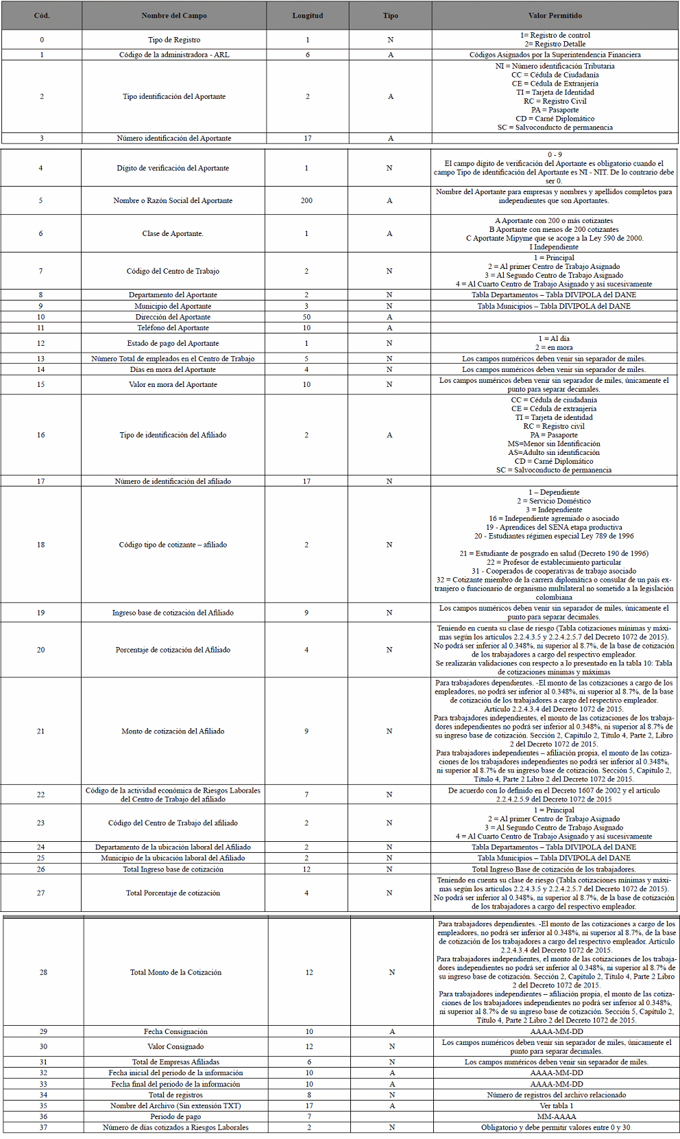 | 1 | Código de la ARL | Alfanumérico | 6 | SÍ | Códigos Asignados por la Superintendencia Financiera |