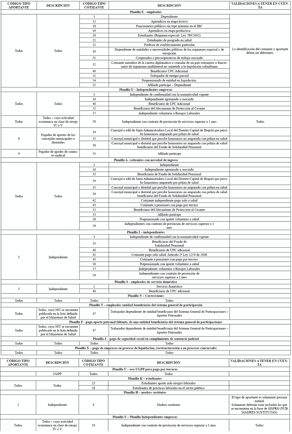 | 9 | Tipo de cotizante-afiliado | 1. Dependiente 2. Servicio dómestico 3. Independiente 4. Madre sustituta 12. Aprendices en etapa lectiva 16. Independiente 18. Funcionarios públicos sin tope basico en el IBC 19. Aprendices en etapa productiva. 20. Estudiantes (Regimen especial Ley 789/2002) 21. Estudaintes de postrado en salud 22.Profesor de establecimiento particular. 23. Estudiante aporte solo riesgos laborales 30.Dependiente entidades o universidades de los regimenes especial y de excepcion. 31. Cooperados o precoperativas de trabajo asociado. 32. Cotizante miembro de la carrera diplomatica o consultar de un pasi extranjero o funcinario organismo multilateral no sometido a la legislacion colombiana. 33. Beneficiario del Fondo de Solidaridad Pensional. 34.Concejal o Edil de junta Administradora local del Distrito capital de Bogotá amparado por poliza de salud. 35. Concejal municipal o distrital no amparado con poliza de salud. 36.Concejal municipal o distrital no amparado con poliza de salud beeficiario del fondo de solidaridad pensional. 40. Beneficiario UPC adicional 42. Cotizante independiente pago de salud 43. Cotizante a pensiones con pago a terceros. 44. Cotizante independiente de empleo de emergenciacon duracion mayor o igual a un mes. 45. Cotizante dependiente de empleo de emergenciacon duracion mayor o igual a un mes. 47. Trabajador dependiente de la entidad beneficiaria del Sistema General de Participaciones-Aportes Patronales. 51. Trabajador de tiempo parcial 52. Beneficiario del mecanismo de proteccion al cesante 53 Afiliado participe 54.Prepensionado de entidad en liquidacion 55. Afiliado participe dependiente 56. Prepensionado con aporte voluntario a salud 57 Independiente con aporte voluntario al sistema de Riesgos laborales 58. Estudiantes de practicas laborales en el sector público 59. Independiente con contrato de prestacion de servicios superior a 1 mes 60. Edil junta administradora local no beneficiario del fondo de solidaridad pensional <Adicionado por la Resolución 1258 de 2021> 61. Beneficiario programa reincorporación <Adicionado por la Resolución 1258 de 2021> | 2 | SI | Será vallidado según la planilla recibida, ver la tabla 11: Tipos de cotizante por planilla. |