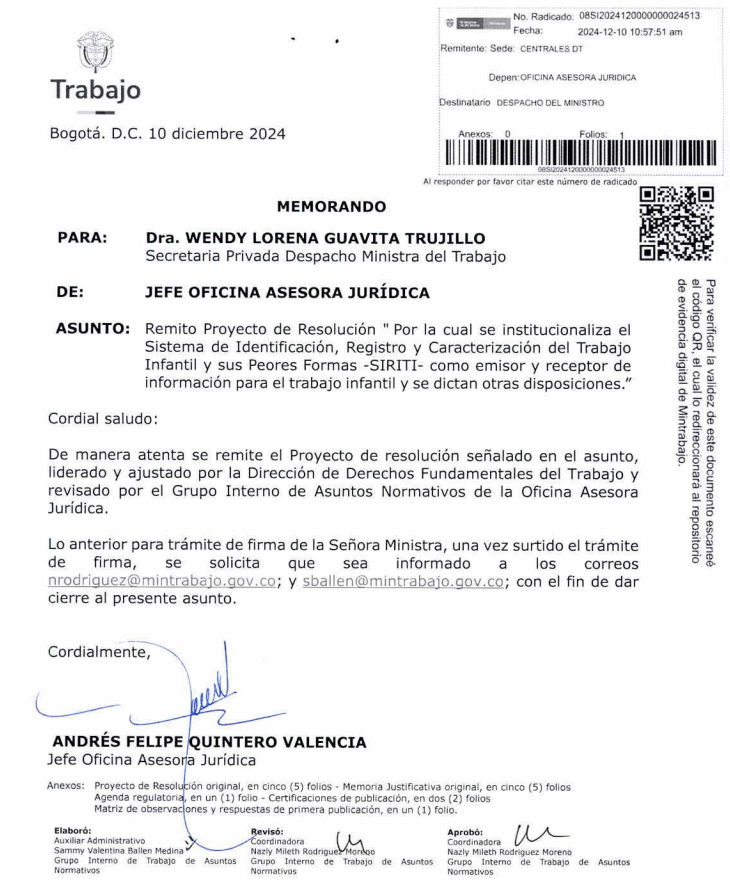 | Proyecto de Resolución | Por el cual se Institucionaliza el Sistema de Identificación, Registro y Caracterización del Trabajo Infantil y sus Peores Formas -SIRITI- como emisor y receptor de información para el trabajo infantil y se dictan otras disposiciones.. |
