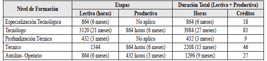 Programas Técnicos: 192 horas equivalentes a 4 créditos académicos, en una proporción de 80% (154 horas) de acompañamiento directo del instructor, de acuerdo con la modalidad del programa de formación, y un 20% (38 horas) de trabajo independiente.