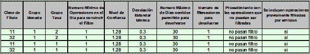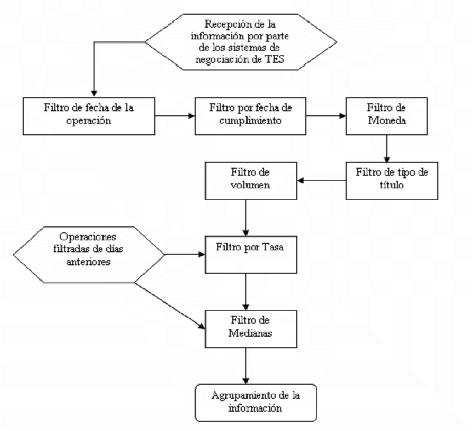 e) Sobre todas las operaciones informadas por los sistemas de negociación (incluyendo subastas de TES) se aplicará en primera instancia un filtro por monto, de conformidad con lo establecido en el presente documento. Una vez realizado dicho filtro, las operaciones resultantes serán tenidas en cuenta para establecer un filtro por tasa. Una vez establecido el filtro por tasa, se realizará un filtro de medianas por precio, margen o rentabilidad, después de los cuales se ignorarán las operaciones que se encuentren por fuera de los límites del filtro de tasa para efectos de calcular precio, margen o índice ITUS.