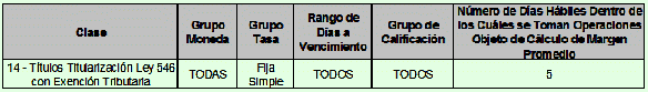 1.23 Categoría para margen promedio: Es la agrupación de los títulos para efectos de obtener margen promedio, resultante de la combinación de las siguientes características: clase, calificación, tipo de tasa, moneda o unidad, días al vencimiento o emisión, como se muestra en el presente documento en el numeral 6.