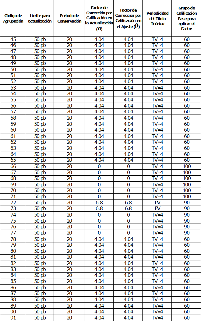 TABLA DE PARÁMETROS PARA EL CÁLCULO DE PUNTOS SINTÉTICOS.