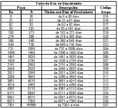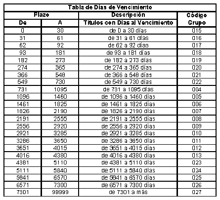 1.22 Días al vencimiento: Son los días contados desde la fecha de celebración de la operación hasta la fecha de vencimiento del título, base 365 días, sin corrimiento de días en caso de caer el flujo en día no hábil y sin considerar el día 29 de febrero de los años bisiestos. Sin perjuicio de lo anterior, para efectos de la clasificación los días a vencimiento podrán agruparse con base en efectos financieros similares.