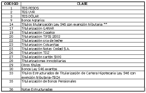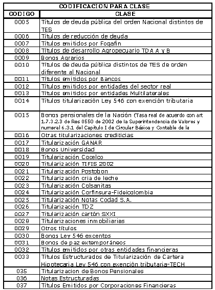 1.20 Clase (CTV): Corresponde a la agrupación básica de los títulos de renta fija efectuada para valorar, que considera el sector del emisor y el tipo de título.