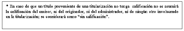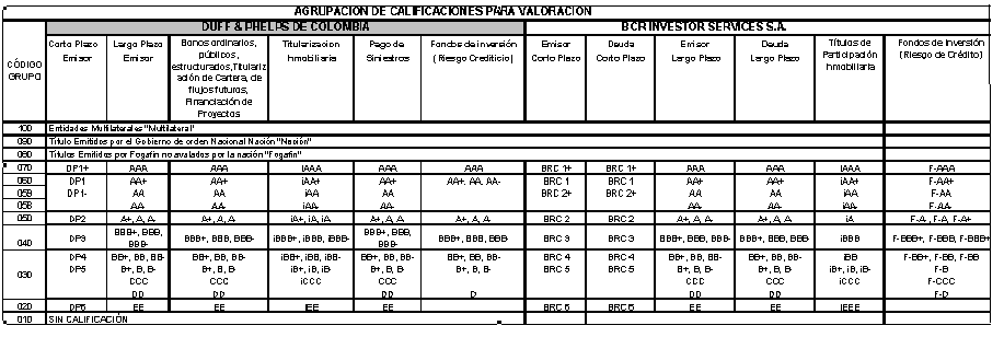 1.19 Calificación de riesgo: Corresponde a una convención que representa una evaluación de la probabilidad de incumplimiento en el pago tanto de capital como de intereses, si se trata de títulos; en el caso de entidades, representa una evaluación de su solvencia y su desempeño, entre otros. Cada tipo de calificación varía de acuerdo con la naturaleza de la emisión, la empresa que emite, su desempeño particular y su cultura empresarial. Sin perjuicio de lo anterior, la calificación podrá corresponder a una agrupación de tipos de calificaciones de las calificadoras con condiciones homogéneas, para efectos de la valoración.