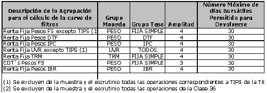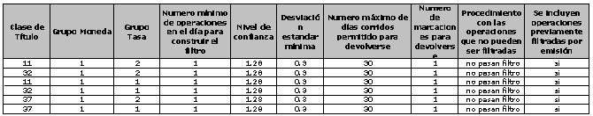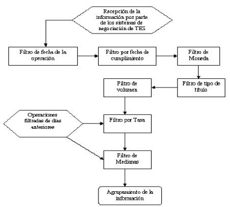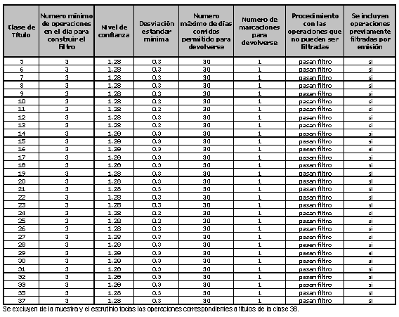 e) Sobre todas las operaciones informadas por los sistemas de negociación o de registro (incluyendo subastas de TES) se aplicará en primera instancia un filtro por monto, de conformidad con lo establecido en el presente documento. Una vez realizado dicho filtro, las operaciones resultantes serán tenidas en cuenta para establecer un filtro por tasa. Una vez establecido el filtro por tasa, se realizará un filtro de medianas por precio, margen o rentabilidad, después de los cuales se ignorarán las operaciones que se encuentren por fuera de los límites del filtro de tasa para efectos de calcular precio, margen o índice ITUS.