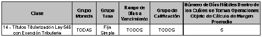 1.23 Categoría para margen promedio: Es la agrupación de los títulos para efectos de obtener margen promedio, resultante de la combinación de las siguientes características: clase, calificación, tipo de tasa, moneda o unidad, días al vencimiento o emisión, como se muestra en el presente documento en el numeral 6.