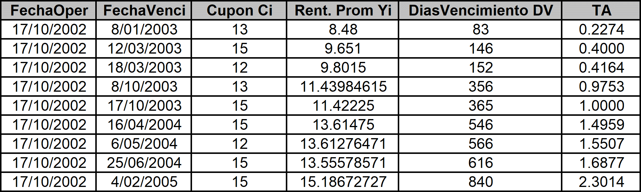 2. Operaciones a utilizar en el procedimiento de estimación de la curva cero cupón