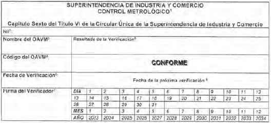 6. Fecha de verificación: Corresponde a la fecha exacla en que se efectuó la verificación metrológica del instrumento de medición, la cual deberá ser fijada de la siguiente manera