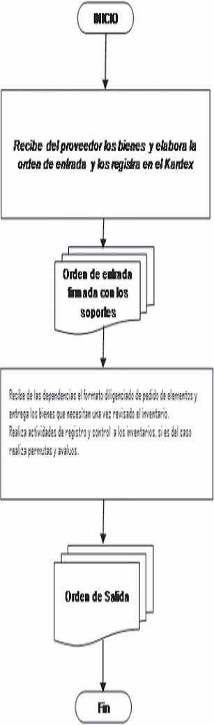 | 6 | Grupo Administración de Recursos Físicos | Técnico y Secretario | Elabora la Orden de Entrada correspondiente, en cuatro originales para distribuirlas de la siguiente manera: – Primer original para el Grupo de Administración Financiera que acompaña la factura con el fin de dar trámite para el pago. – Segundo original como soporte de la cuenta mensual del almacén que se entrega al Grupo de Administración Financiera. – Tercer original soporte de la base de datos del Kárdex. – Cuarto original como soporte de la cuenta mensual del archivo del almacén. Nota: La Orden de entrada debe contener, la siguiente información básica: -- Lugar y fecha -- Número de comprobante, en forma ascendente y continua. -- Identificación del Almacén y bodega, si es el caso. -- Negocio Jurídico que dio origen a la transacción y número del documento soporte; especificando: nombre del proveedor, documento de identidad o NIT, nombre y agrupación del elemento, unidad de medida, cantidad, valor unitario, valor total por elementos en números y en letras, valor total del comprobante, en número y letras, firma del encargado del almacén y visto bueno del Coordinador de Recursos Físicos. | |