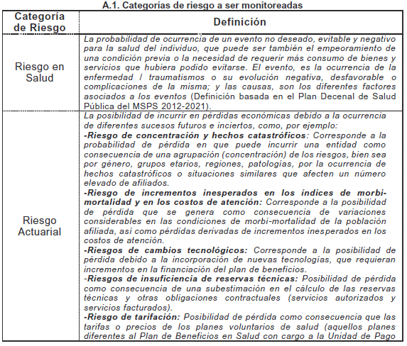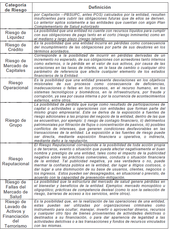 Las categorías de riesgo..ver definiciones en anexo- sobre las cuales la SNS está desarrollando este marco de supervisión son las siguientes, lo cual no excluye que las entidades supervisadas gestionen categorías adicionales en sus modelos de administración de riesgos: