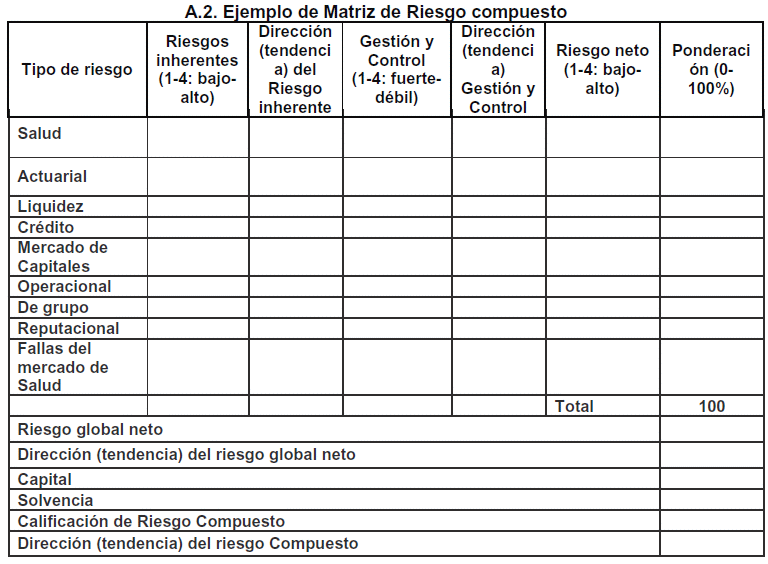 Es la calificación "final" de la entidad regulada y refleja la evaluación del nivel de seguridad y solidez de la institución por parte del supervisor. La SNS establecerá un método para ponderar los riesgos netos, de conformidad con la probabilidad de su ocurrencia e impacto y su importancia en las metas de la autoridad supervisora. La importancia puede ser clasificada como baja, media o alta y permite ponderar los diferentes riesgos netos. El riesgo neto global es una evaluación de los posibles efectos adversos que el conjunto de las actividades significativas de la institución regulada podría tener en la evolución de los resultados y sostenibilidad de la entidad, y, por lo tanto, sobre los usuarios del SGSSS. El riesgo global neto se valora como bajo, moderado, por encima del promedio, o alto, y su dirección (tendencia) en el tiempo se evalúa como decreciente, estable o en aumento. De esta forma, la calificación del riesgo compuesto será el resultado del riesgo neto global, moderado por la robustez financiera de la entidad, teniendo en cuenta entre otros, el capital y solvencia. Esta calificación es un factor clave para determinar la respuesta del supervisor y en la definición de un plan institucional que responda a la realidad de la entidad.
