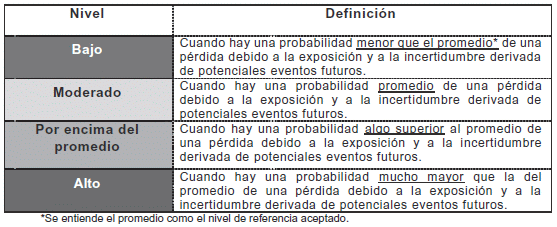 En cada evaluación se genera una calificación de acuerdo con su nivel: bajo, moderado, por encima del promedio y alto. Las definiciones de los niveles de riesgos se presentan en la siguiente tabla.