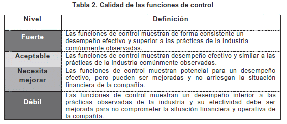La calidad de las funciones de control de la gestión de riesgos se evaluará como fuerte, aceptable, necesita mejorar o débil.