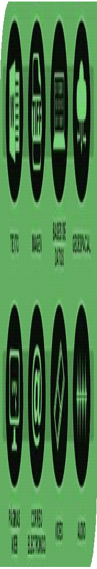 7. Dentro de este amplio espectro, se encuentran los siguientes tipos de información: texto, imagen, bases de datos, geoespacial, páginas web, correo electrónico, video, audio.