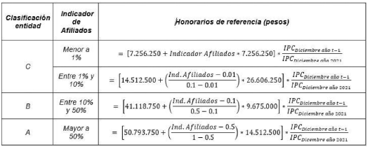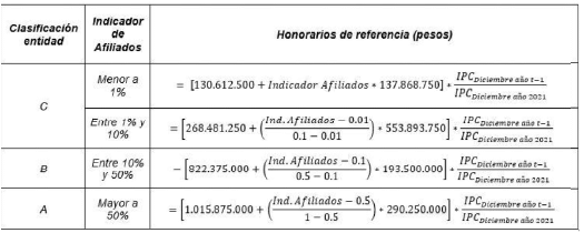 Cálculo de honorarios según la categoría de la Entidad Administradora de Planes de Beneficios y el indicador de afiliados activos.