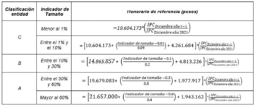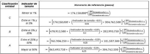 Los honorarios de referencia se calculan con base en el indicador de tamaño definido por la siguiente fórmula:
