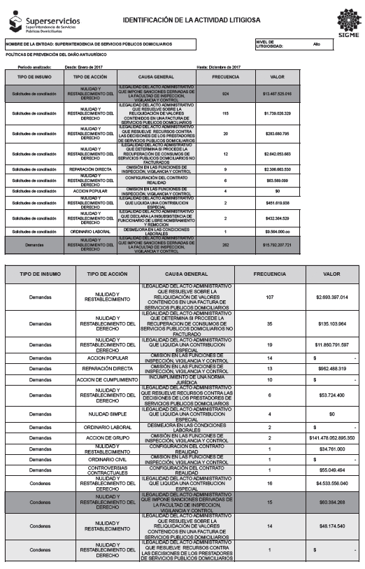 “1. Identificación de las actividades litigiosas de la Entidad en donde se debe analizar: 1.1 Tipo de Insumo. 1.2 Tipo de Acción. 1.3 Causa General. 1.4 Frecuencia. 1.5 Valor.